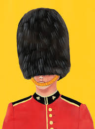 this image shows a painted picture of one of the Queens guards in his red jacket and busby